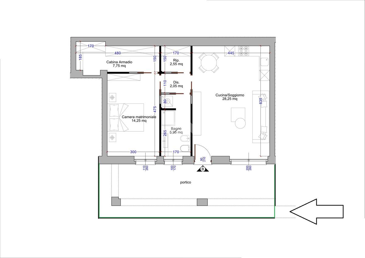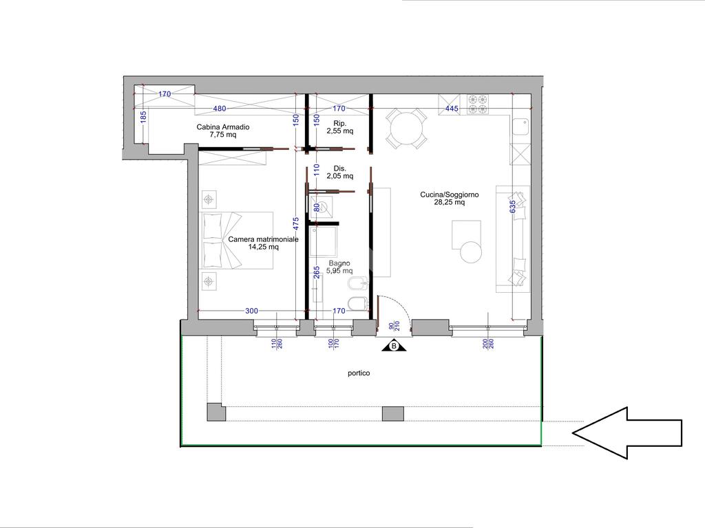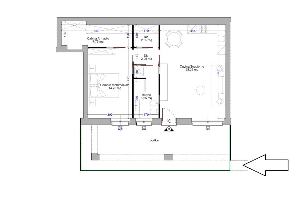 All’interno, ambienti moderni e funzionali: luminoso soggiorno con cucina a vista, disimpegno con ripostiglio, bagno finestrato con doccia e una camera matrimoniale con cabina armadio pensata per il massimo comfort.